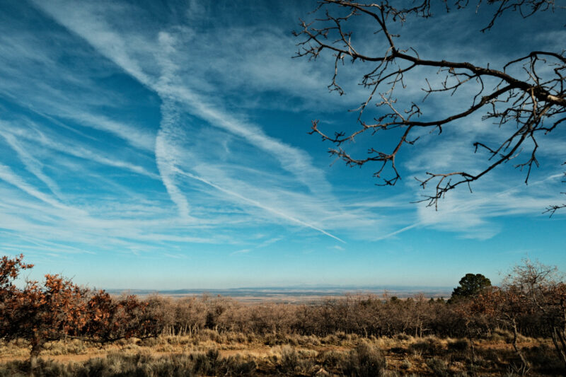 I paused on the way back to camp to make the image. I was intrigued by the convergence of the contrails and how the sky interacted with the branches.