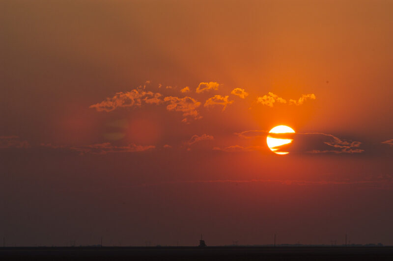 While there I did not take sufficient advantage of the photographic opportunities that the storms presented. The frame from a few days ago and the preceding frame earlier are a couple of examples of when I did. On the same outing that gave me the cloud image, I was blessed with a gorgeous West Texas sunset. There are some tendrils of clouds kicked up by the oncoming storm visible in the frame. I noticed that interaction developing and waited for the right moment.